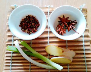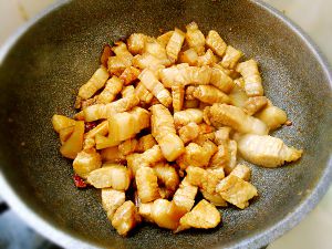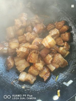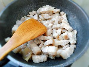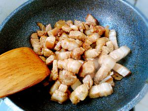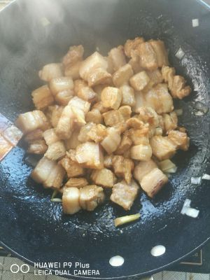 用油起锅,放入五花肉用小火煸炒至出油,然后倒入姜片、桂皮、八角、葱段,淋入适量老抽,炒至上色。