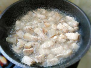 锅中注水,烧开后,放入五花肉块、淋入料酒,焯煮至转色后控水捞出。