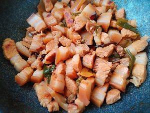 放入备好的红腐乳根据肉量放两到三块,翻炒