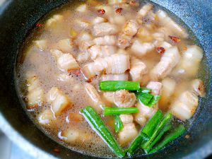 放入少许葱段,放入适量的水没过五花肉,烧开后盖锅盖转小火焖炖35-40分钟