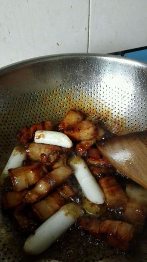 倒入五花肉煸炒上色后烹入白酒,放入葱段,姜片。