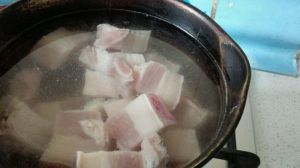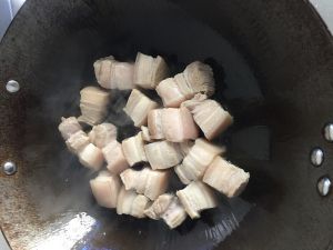 将五花肉切块,放入冷水锅中,加入几片姜和料酒,水开后转小火约10分钟,锅中可见血水沫,捞出肉块,洗净。