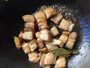 锅里倒一些油,可以比平时炒菜多一点油,油热后放白砂糖炒,不要不舍得放糖!500克的肉怎么也得放五大勺糖(家里吃饭用的普通瓷勺,不是盛汤的大勺子哈!)炒糖时要不停翻动,一是为了上色,二是味道一级棒!等把糖炒至融化变褐色后,立刻把猪肉块放进去,翻炒!直到肉块均匀上色!