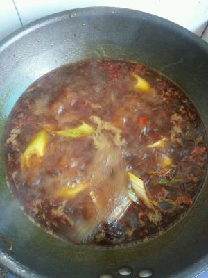 锅内放油(我用的老家的菜籽油,调和油也可以)油烧开后放豆瓣酱,蒜,姜,八角,花椒,炒到颜色变深,放入水,再放大葱段,添加酱油,鸡粉,白糖,熬10分钟。