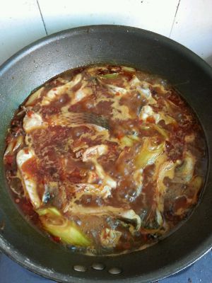 放入腌好的鱼,先放鱼头煮两分钟再放鱼块煮8分钟,捞起鱼放入单独的一个碗里备用。再把自己准备的素菜放入锅内煮熟。