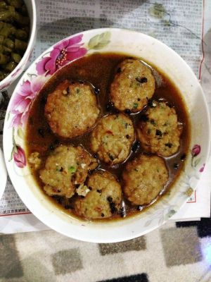 开油锅炸肉圆,先用大火一下子将肉圆炸定型,再转小火炸至微金黄。沥干油捞出。狮子头可以放进冷冻室裡面分次烧