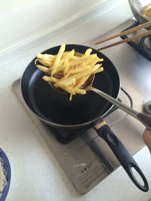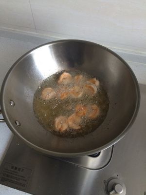 到入适量油预热到六七分,倒入虾炸,漏油。再倒入炸。漏起