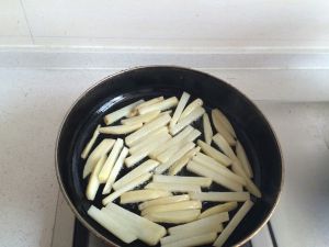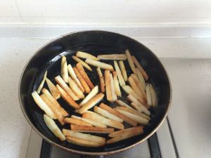 把芋头 切成条 放入刚炸完虾的油里炸 炸到芋头干身 就可以捞上来隔油