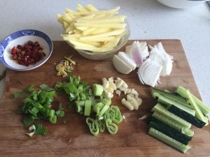 土豆切条 洋葱切块或粗丝 黄瓜切条 葱花 蒜切碎 姜切碎 干辣椒剪小段