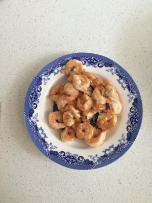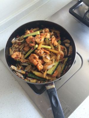 锅内加入干辣椒段,加虾煎炒,加入适量酱油,花椒,味精,芝麻,待差不多时加入小葱末,起锅。