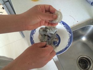 大虾去虾皮 虾线 开背 虾不去皮最好 儿子不吃皮 又嫌麻烦 所以就去皮了