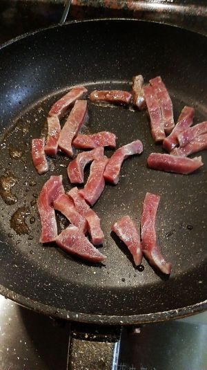 牛肉加糖,料酒,生抽,生粉拌匀,腌制10分钟左右,用量以刚好感觉充分拌匀即可,不要多出汁水。如果你多出来了,就证明,亲你放多了。油七八成热时,先滑牛肉,入锅后,锅离火,牛肉滑散,再上火,炒个两分钟乘除,待用。