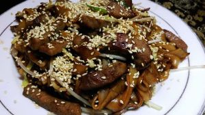 放河粉大火翻炒,加入海鲜酱油,两滴老抽,少许盐,少许糖,翻炒几下,再把牛柳,豆芽韭黄放进去,大火翻炒。