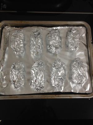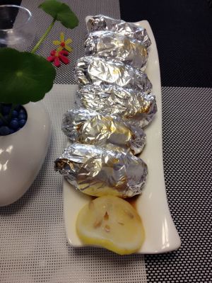 烤盘铺上锡纸,放上包好的鸡翅(锡纸有接口的地方朝上,这样会减少鸡汁柠檬汁的流失)。