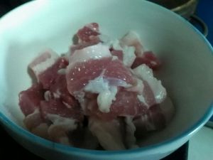 猪肉买回来,切成大小均等的条状,姜切片,蒜排碎