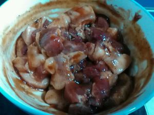 倒入料酒去除肉的腥味,也可以用姜蒜葱段水腌制去腥,腌制一小时,吸干水分