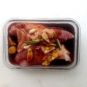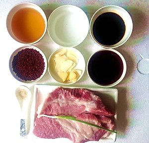 低度白酒2大勺 蚝油2大勺 红曲米15G 生抽4大勺 蒜片姜片适量 蜂蜜3大勺 胡椒适量 梅花肉500G