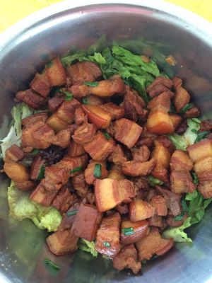 等锅里的肉和水在开的时候,这时候就要把火调小一点改用中火了,用中火慢慢煮,煮30-40分钟,如果煮到水快干了肉吃起都还不是很软的话,那就再加点开水,试一下有没有咸味,如果没有什么咸味,可以再加一点盐,不要太咸,根据你平时做菜的口味,然后再煮个10-20分钟的样子,因为肉要煮的很软吃起来才好吃,把水快煮干的时候放入味精、鸡精和葱,好,这时候把红烧肉盛入之前装有生菜的容器,好,这时一到香喷喷的红烧肉就做好了