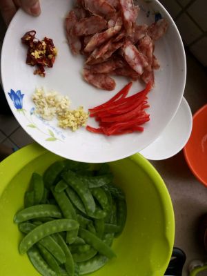 没图了……1.油热了加入大蒜……2.十秒后加入腊肠……3.翻炒40秒后加入荷兰豆,同时加入一点生抽,一点盐,少点……4.翻炒1分钟,即可出锅……