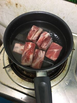 排骨洗净,葱打结,姜切片,因为我家都不怎么喜欢吃葱姜,所以就在焯得时候放了。水烧热,放排骨焯好捞出