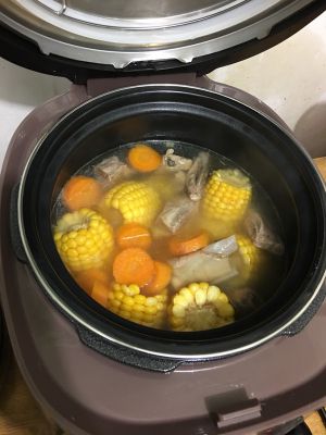 排骨重新放入锅中,放冷水继续烹煮,待水开之后就可以放玉米与胡萝卜啦~ 一起煮两个小时左右~想要排骨炖化的可以多煮会儿呦~喜欢排骨筋道的一个半小时左右就够啦~记得放少许盐,本汤品可不适合多盐喏。