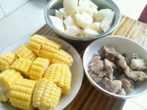准备食材 1.排骨切焯水 2.玉米切断 3.藕去皮切块