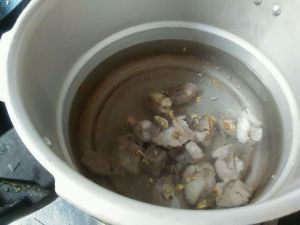 在高压锅内加入适量的清水,加入排骨,花椒,姜,适量的盐,炖20-30分钟。