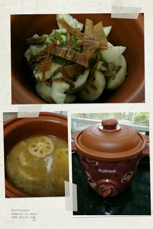 3⃣将莲藕、排骨、花生和姜丝一起放入高压锅中,加入适量的盐和水,盖上锅盖,调好时间即可,煲汤时长至少1小时。