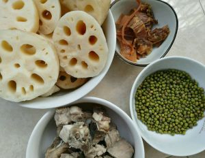 准备材料:排骨放沸水里煮1分钟左右后捞出备用,莲藕洗干净后切成大块,章鱼干洗干净后用剪刀剪成小块,绿豆也清洗干净备用。
