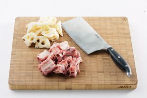 准备好食材,莲藕切去两头的蒂,纵向刨开成两半,清洗干净,检查藕眼内有无残余泥沙,再切成长边约6cm的滚刀块。