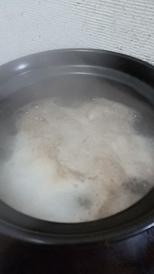 等到锅在开的时候放入盐~煮半个小时 熟了~可以放点葱花和香菜 因为家里没香菜了没点坠
