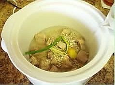 将汆烫好的排骨洗净,和泡好的薏米仁、生姜片、葱段放入慢炖锅,一次性加入适量的开水,大火煲开后转中小火煲2-3个小时左右;
