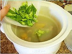 煲2-3小时以后打开盖子,加入苦瓜继续煲制20-30分钟,加入盐调味即可。