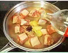 水烧开后放入洗净的排骨,加入八角、生姜、料酒汆烫几分钟;