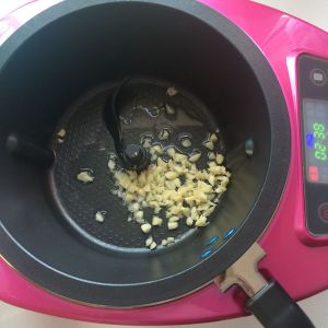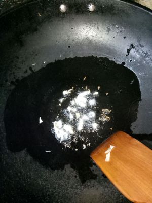 锅里放植物油,烧至冒烟,用勺舀一些慢慢淋在蒜末辣椒上,此时香味出来了。