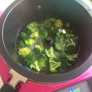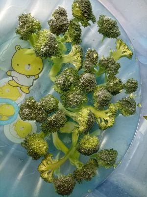 西蓝花,去帮,掰成小块,放入小盆里加水加盐,备用。