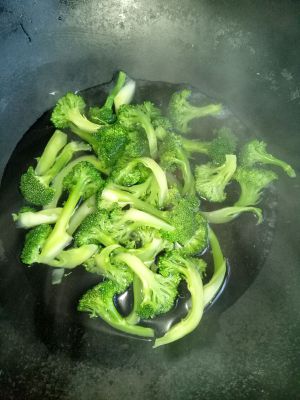 西蓝花掰成小块后,放进盐水中浸泡20分钟 捞出洗净,冷水下锅,水沸后再煮五六分钟,把西蓝花煮熟(西蓝花很吸油,不易熟,所以提前煮熟)