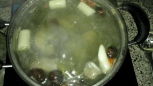 开过之后再把萝卜和玉米倒进去。松茸下锅比较早是因为可以提味。大火烧开之后再改为小火慢炖。我炖了一个半小时,可以尝一下排骨肉软了即可。