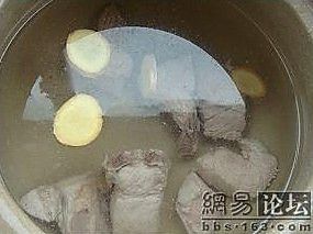 排骨斩成小段(让超市人员代劳),洗干净后放入清水中,煮开去除血末浮物