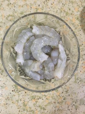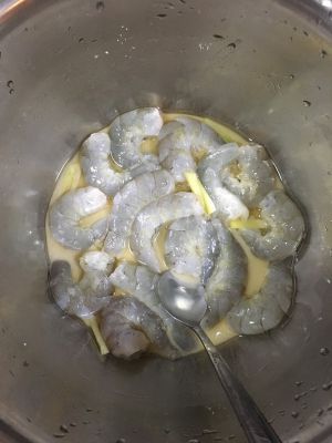 鲜虾去壳去泥肠加料酒,生姜,生粉腌制十分钟