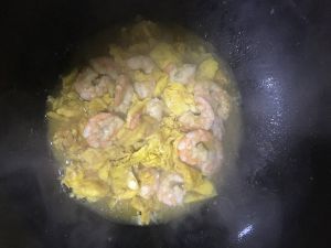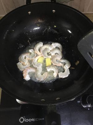 国内留少许油,葱花爆锅,翻炒虾仁至变色