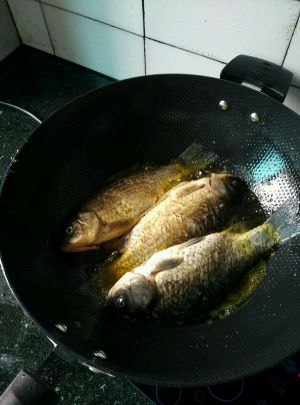 热锅下油,放入鲫鱼煎,一面煎好翻边煎另一面。