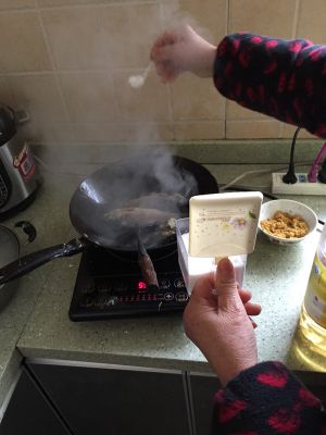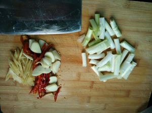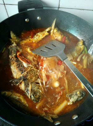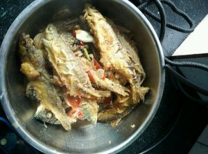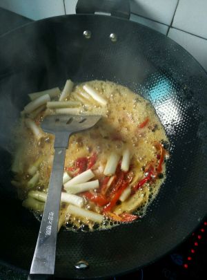 待鱼煎得差不多时放入姜,蒜,葱头,辣椒一起同鱼煎出香味