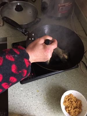 锅烧热下油,加入适量食盐,将鱼放入锅中,两面都要煎至稍焦,大约三分钟。若油太少,还可中途加一点