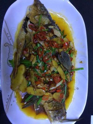 大火收汁,加入鸡精调味,将鱼整条盛入盘中,锅底姜蒜,辣椒铺在鱼上,放入葱段,爱吃香菜的朋友也可以同事加入香菜,将锅底汤汁淋在鱼上,完成!