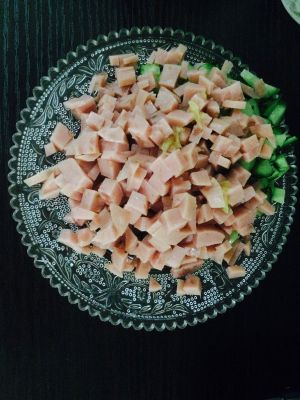 将黄瓜火腿鸡蛋和米饭放入锅里炒熟