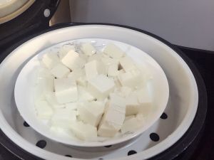 水烧开放入一勺盐。嫩豆腐放入锅里。煮沸腾。