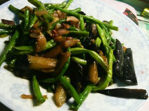 茄子切成长条,豇豆同样切成3-5厘米小段,洗净,待用。