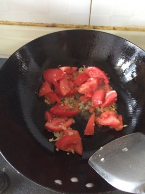 另起一锅,加入少许底油,蒜末爆香后加西红柿加盐改小火炒软。