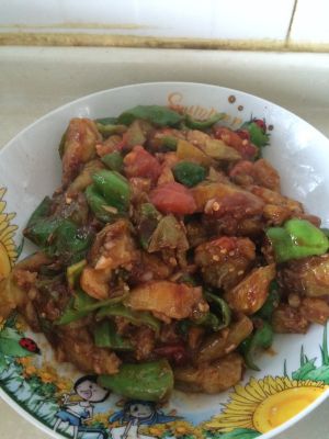 加入炸好的茄子和青椒,略炒一下后倒入刚刚调和的汁子,大火收汁。